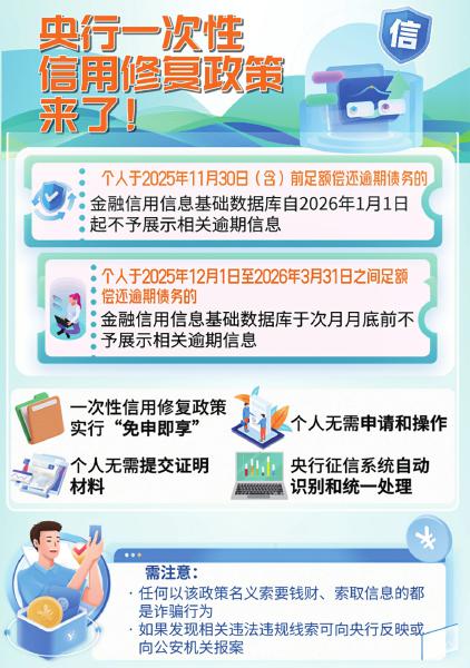同时,需要提示的是,虽然本次政策设置了截至2026年3月31日的3个月宽限期,但该政策是对符合条件的征信信息的一次性特殊处理,只适用于2025年底前产生的逾期信息,2026年新产生的逾期信息不包括在内。因此,大家也需要根据自身债务承受能力合理控制负债水平,避免过度透支或多头借贷,及时足额偿还债务,注意积累良好的信用记录。