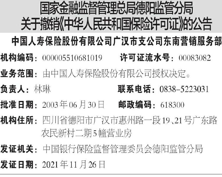 ·国家金融监督管理总局德阳监管分局关于撤销《中华人民共和国保险许可证》的公告