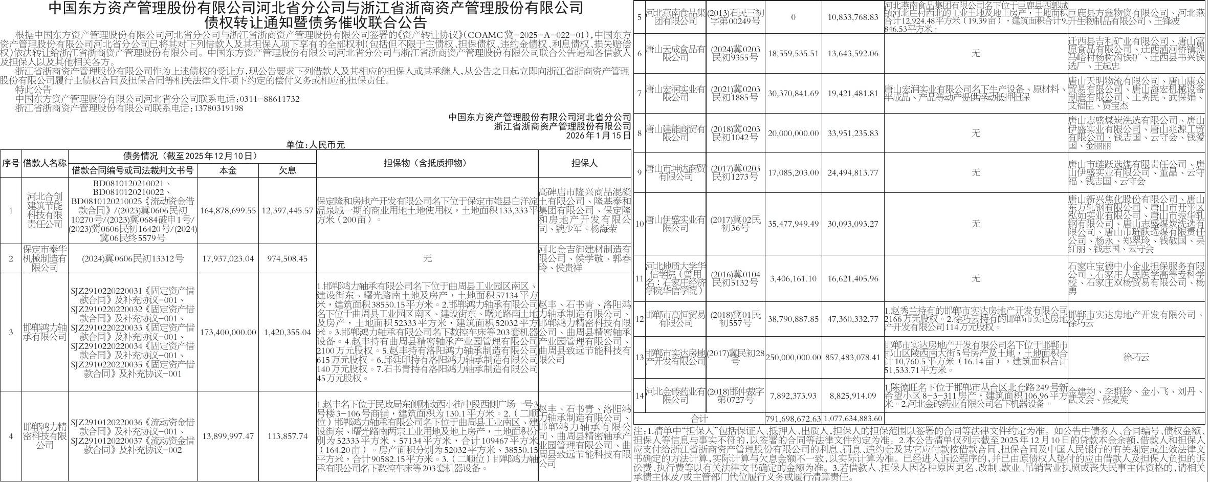 ·中国东方资产管理股份有限公司河北省分公司与浙江省浙商资产管理股份有限公司债权转让通知暨债务催收联合公告