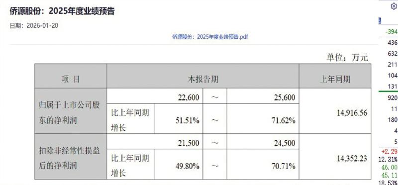 2025 年业绩持续回暖的侨源股份交出了一份亮丽的业绩预告,业绩增速明显加快。根据1月20日晚间公司发布的公告来看,侨源股份预计2025年实现归属于上市公司股东的净利润为 2.26 亿元至 2.56 亿元,同比增长 51.51%至 71.62%;实现扣除非经常性损益后的净利润为2.15亿元至2.45亿元,同比增长49.80%至70.71%。