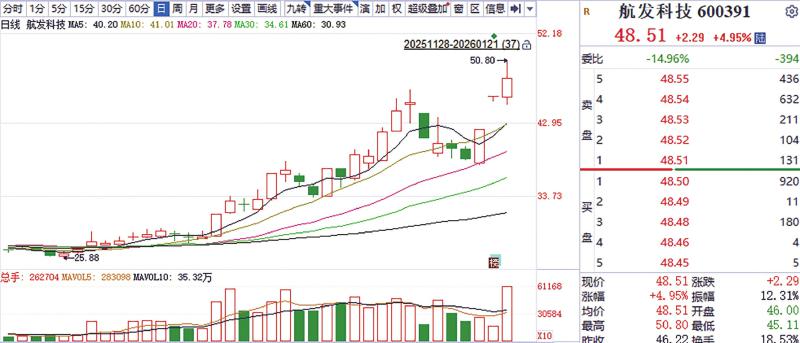 在经历之前一轮接近翻番行情后航发科技短线快速回调,四个交易日出现约15%的跌幅。而就在股价触及20日均线后,超跌反弹迅速展开。1月19、20日,连续两个交易日航发科技均收于涨停板上,本轮反弹的收盘新高已被刷新。