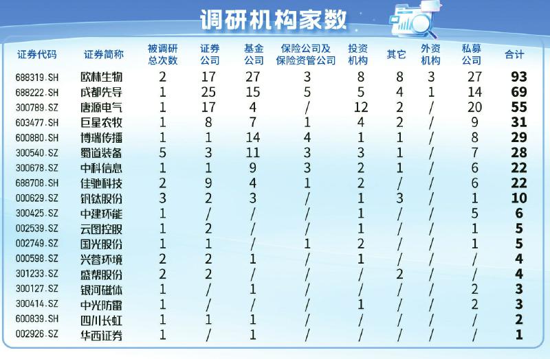 从机构调研频次来看,欧林生物获得93家机构调研,高居机构关注榜首位。成都先导、唐源电气等四川上市公司则获得超过50家机构调研,分列机构关注榜第二和第三位。