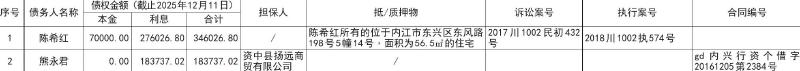 根据内江兴隆村镇银行股份有限公司大千支行、内江兴隆村镇银行股份有限公司资中支行与威远盛弘投资有限责任公司签订的《债权转让协议》约定,内江兴隆村镇银行股份有限公司大千支行、内江兴隆村镇银行股份有限公司资中支行将其对借款人陈希红、熊永君及其担保人享有的主债权及借款合同、担保合同、还款协议和其他相关协议项下的全部权利及实现和执行资产相关的全部权利转让给威远盛弘投资有限责任公司。债权明细情况如下: