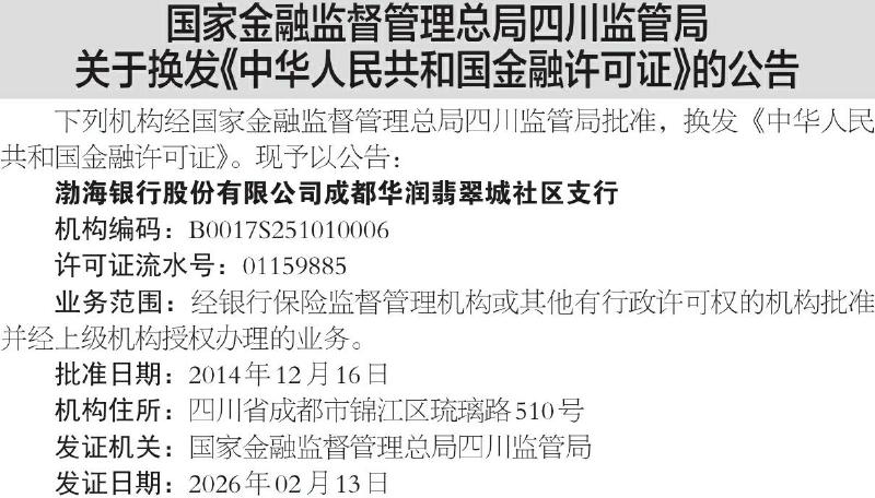 • 国家金融监督管理总局四川监管局关于换发《中华人民共和国金融许可证》的公告