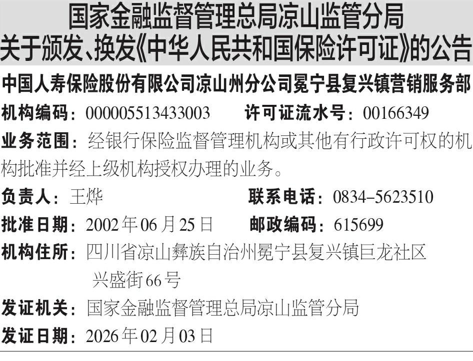 • 国家金融监督管理总局凉山监管分局关于颁发、换发《中华人民共和国保险许可证》的公告