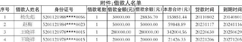 下列4名借款人(详见附件)在贵州乌当农村商业银行股份有限公司新添寨支行办理了农户贷款。因未按约还本付息,截止至2026年3月2日止,下列借款人个人贷款本息已逾期,现根据《中华人民共和国民法典》及相关法律、法规的规定,予以公告。本公告清单列示截止2026年3月2日的贷款本金余额、累计欠息金额,借款人应支付的利息按借款合同及中国人民银行的有关规定计算。请下列借款人从公告之日起立即与贵州乌当农村商业银行股份有限公司新添寨支行联系,主动履行借款合同所约定的还本付息义务。否则,贵州乌当农村商业银行股份有限公司新添寨支行将依法进行起诉,现特此催告。