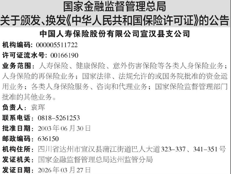 ·国家金融监督管理总局关于颁发、换发《中华人民共和国保险许可证》的公告