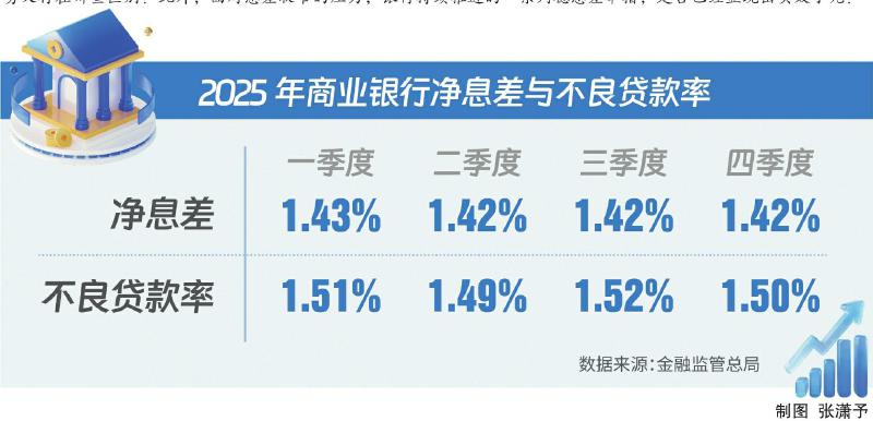 国家金融监督管理总局今年2月披露的2025年银行业主要监管指标显示,2025年四季度末的商业银行净息差维持在1.42%,与三季度末持平,并且已连续三个季度稳定在该水平。