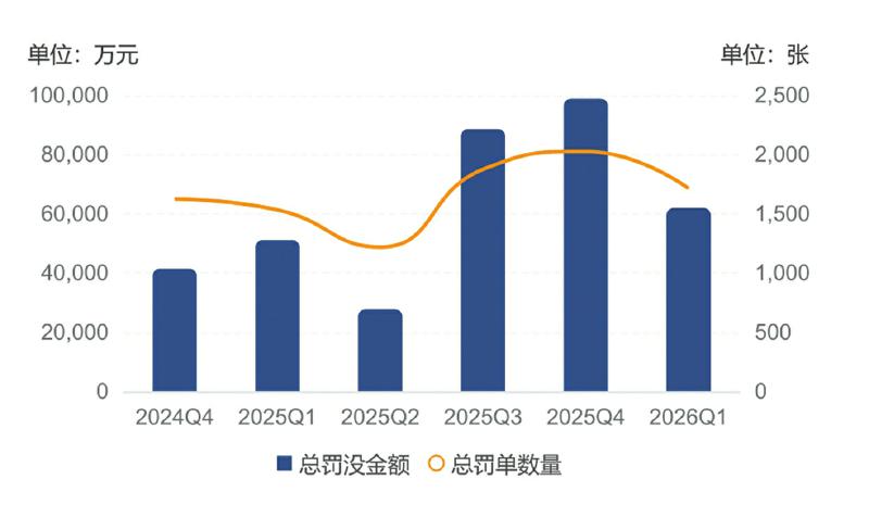 记者注意到,罚单数量和罚没金额的环比双降主要是因为百万元以上的大额罚单数量减少。数据显示,2026年一季度,监管部门共针对银行机构及从业人员开出129张大额罚单,较上季度减少25张;大额罚单罚没金额3.68亿元,较上季度的7.37亿元减少了一半。