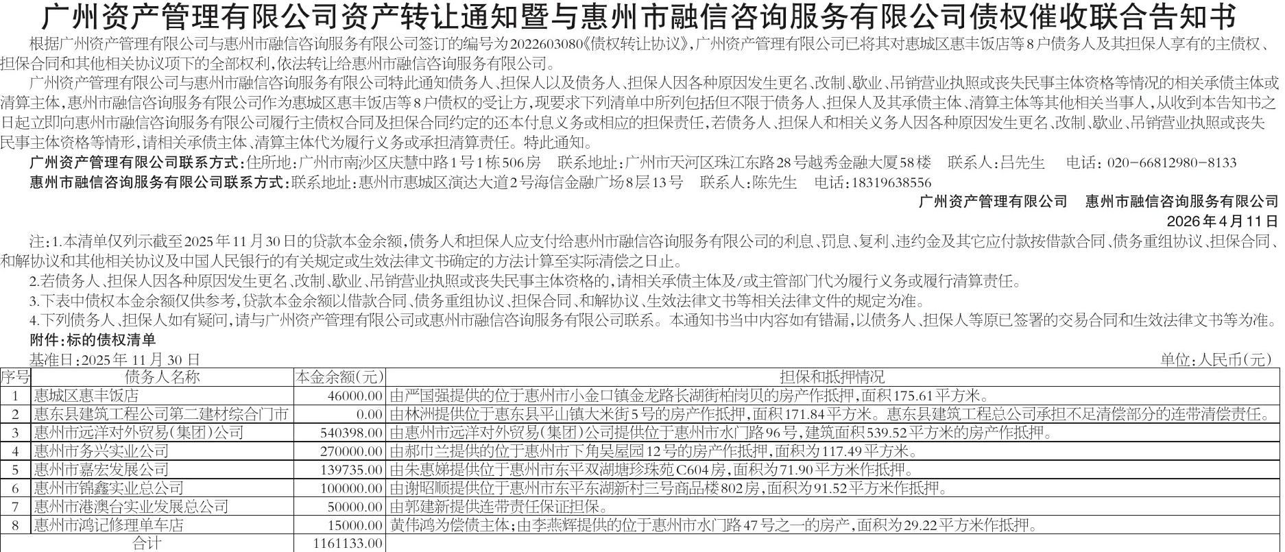 • 广州资产管理有限公司资产转让通知暨与惠州市融信咨询服务有限公司债权催收联合告知书