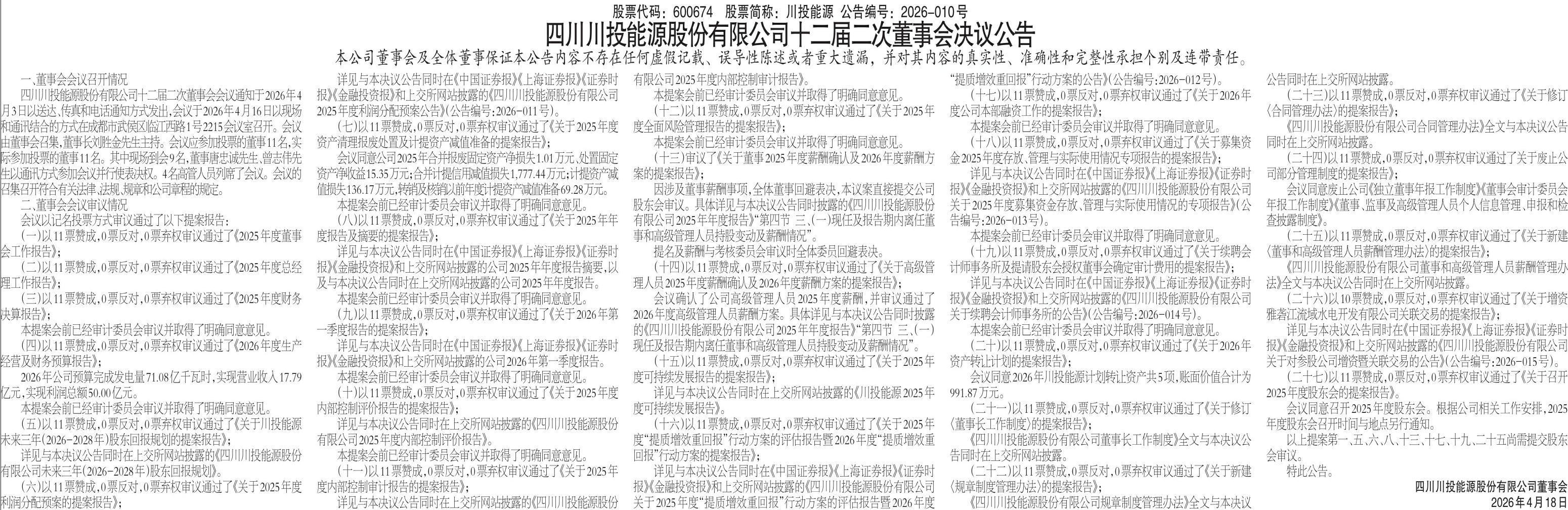四川川投能源股份有限公司十二届二次董事会决议公告